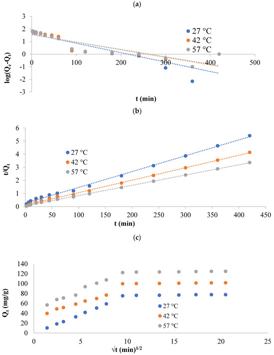 The practical outcomes for the adsorption of 150 mg/L of CR solution by Zn/Cu-FVSP at 27, 42, and 57 °C and different periods (0–7 h) were analyzed by the linear dynamic Equations (4)–(6) of the 1st and 2nd orders and intra-particle diffusion, respectively.