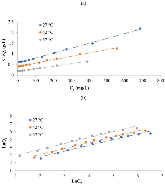 Table 4 also shows that the computed Qmax values at 27, 42, and 57 °C are 434.78, 625.00, and 833.33 mg/g, in that order. These higher adsorption capacities were due to the higher surface area and the presence of effective surface functional groups on the surface of Zn/Cu-FVSP.
