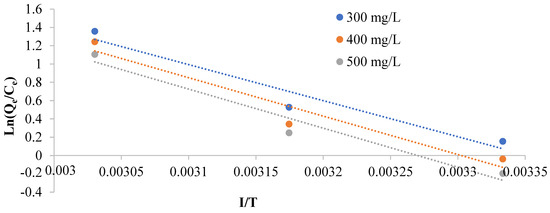 By using Equations (12) and (13), it was possible to calculate the coefficients of the thermodynamical (∆Go, ∆So, ∆Ho) for CR adsorption from its solutions (300, 400, 500 mg/L) on the surface of Zn/Cu-FVSP (0.015 g).