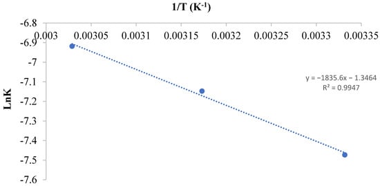 Figure 9 displays the values of lnK plotted vs. 1/T. The slope of the linear curve shown in this figure (Figure 9) was used to estimate the energy of activation (Ea, KJ/mol) for this adsorption. The obtained Ea value (15.3 kJ/mol) from this work is in the 0.2–38 kJ/mol range. This is another example that confirms that this adsorption is caused by an ionic exchange mechanism [62].