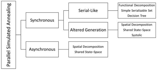 Greening [25] divided parallel simulated annealing (PSA) algorithms into two main categories. Synchronous algorithms share information during runtime, while asynchronous algorithms have limited or no communication. Synchronous algorithms calculate the same cost function. Asynchronous algorithms work faster by ignoring synchronization and allowing errors but result in lower outcome quality. Synchronous algorithms are divided into two subcategories: serial-like and altered generation. Serial-like algorithms generate new states as applied in a sequentially running algorithm. Altered generation applies different strategies for state generation.