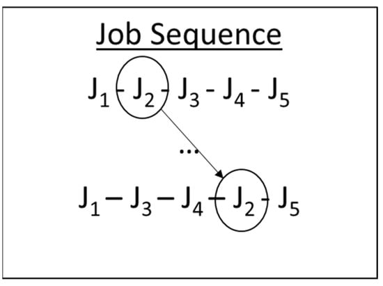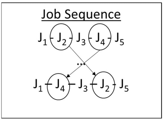 Congruently to an insert operation, two positions should be determined for swap operations. Let and be integers from the set . In the swap operation, the positions of and are changed mutually. The positions of the remaining jobs do not change. The example in Figure 3 shows the swap operation of Job 2 and Job 4.