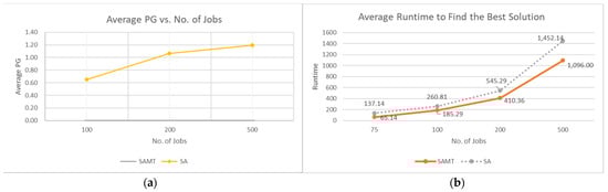 where the objective function in Equation (1) minimizes the sum of total earliness and tardiness; the constraint in Equation (2) ensures that the completion time of a job on a machine is the summation of the completion time of the preceding job, the slack time between these jobs, and the processing time of the job; the constraint in Equation (3) guarantees that the completion time of the first job is its total processing time on all machines; the constraint in Equation (4) calculates the earliness or tardiness by comparing the completion time and due date of each job; and the constraints in Equations (5) and (6) ensure that each job has only one predecessor and successor, respectively. The model consists of jobs to satisfy the constraints in Equations (5) and (6). Equation (7) is a virtual constraint that assigns the first (dummy) job as the predecessor of the last (dummy) job. It is assumed that each job is processed without any delay once any operation of the predecessor job does not cause any violation for no-wait processing to be aligned with real-world applications. Thus, the values of slack time are fixed for any consecutive jobs independent from their position in the schedule. The calculation of is broadly explained by Röck [47].