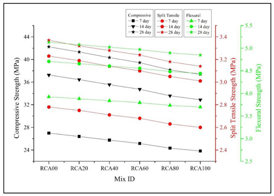 Unlike workability properties, strength properties of SCC mixes are gradually reduced over the varying replacement levels of RCA. It is also observed that it is possible to create an SCC mix by replacing the percentages of RCA either partially or completely (Figure 1). Commencing from 0% to 100%, each mix created with RCA complied with self-compatibility standards [31]. An increase in the percentage of RCA content in concrete will decrease the strength, elastic modulus, and thermal conductivity, while porosity and water absorption will be increased [32].