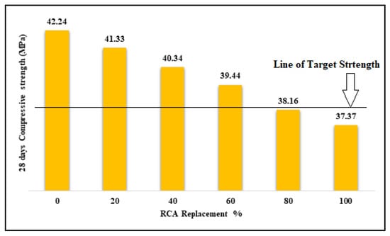 - At 28 days of curing, the compressive strength of the conventional concrete decreased by 2.2%, 4.5%, 6.6%, 9.7%, and 11.5% when the replacement of recycled concrete aggregate (RCA) content increased from 20% to 100% at intervals of 20%.