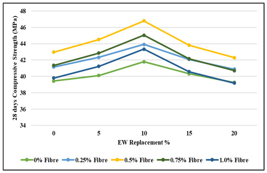 In light of the test results, it is concluded that better results and yielded stability were observed when 10% EW replaces the fine aggregate in concrete, irrespective of the fibre concentration [36]. It is also observed that the target strength was achieved in all SCC mixes created with varying levels of EW and fibre content. After a 10% replacement level of EW, segregation occurs, causing a rapid decrease in strength [37]. According to Dhanraj et al. (2017) [38], EW is replaced with fine aggregate in concrete in order to reduce the weight and it can offer fine strength along with durability just as conventional concrete. Moreover, the inferred results indicate that the EW performs better, and can be used as a substitute for the fine aggregate portion of conventional concrete [15]. It is also observed that an addition of 0.5% PF enhances the strength of concrete by 10.8% compared to the the conventional mixes made without RCA, EW, and PF [39,40]. Likewise, the other strength properties, such as split tensile and flexural strengths, express the behaviour in the same way as compressive strength. Hence, it is concluded that the optimum amount of ingredients for FRSCC is 60% of RCA, 10% EW and 0.5% of PF, which pertains to the experimental investigations.
