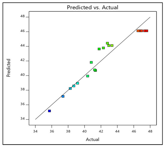 As a result of the ANOVA for the quadratic model used in the CCD, the model’s F-value and p-value are 14.52 and less than 0.05 implies that the model is significant. In this case, A, B, C, A2, B2, and C2 are significant model terms. p-Values greater than 0.10 specify that the model terms are not significant [47]. If there are many insignificant model terms, the model reduction will expand the model. The predicted R2 of 0.6866 is a sensible agreement with the adjusted R2 of 0.8649, i.e., the variance is less than 0.2. Model precision measures the signal-to-noise ratio [Table 12]. A ratio greater than 4 is desirable in CCD, whereas the model shows 11.626, which is an adequate signal [48].