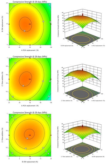 In light of the increasing error in response prediction, as the distance is increased from the centre of the modelled area, it is prudent to limit the practice of models to a range that is limited by values corresponding to limits (−α to +α). The parameters are carefully calibrated to achieve a CCD in which the effect of each factor has been carefully assessed at three diverse levels in coded values of −α, 0, +α. The strength of FRSCC at 28 days was given Equation (1), which is a full quadratic model [44,45].