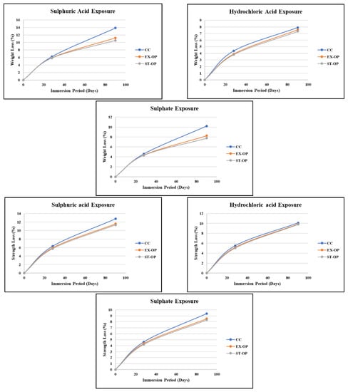 - ST-OP shows a weight loss of 3.91% and 7.56% from the CC mixes for a period of 28 and 90 days of immersion in a hydrochloric acid solution. However, EX-OP shows 3.80% and 7.32% from the CC mixes.
