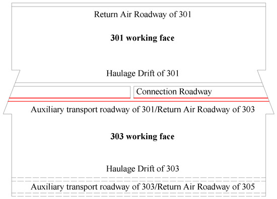 The average mining depth of a 301 working face in a mine is 750 m, which is classified as deep mining. The coal seam has an average thickness of 4.7 m and an average dip angle of 1°. The working face adopts a three-lane system layout of belt haulage drift, auxiliary haulage drift and return air drift. The roadway layout of the working face is shown in Figure 1.