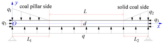 In the Figure 5, L is the width of the roadway, d is the thickness of the floor, L1 is the width of the fracture zone at the coal pillar side, L2 is the width at the fracture zone at the solid coal side, q is the load intensity of the lower floor to the immediate floor, q1 is the load concentration within the fracture zone range at the coal pillar side, q2 is the load concentration within the fracture area range at the solid coal side and q3 is the horizontal stress concentration.