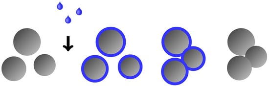 It is assumed that the binder solution is distributed uniformly on all particles and that the solvent evaporates completely. In order to transform Equation (4) to a volume-based formulation