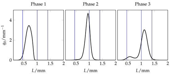 where is the desired bed mass and is the particle density. The integral term on the right-hand side describes the first moment of the particle size distribution and corresponds to the total particle volume in the fluidization chamber. Differentiating Equation (20) and inserting the PBE (2) yields the ideal withdrawal rate