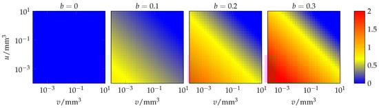 Agglomeration kernels for variations of b. Colors indicate rate of agglomeration for different volume combinations.