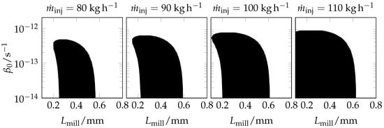 The layering growth rate G is directly proportional to the binder injection rate . Therefore, increasing the latter results in faster particle growth and more particles in the oversized fraction, preventing the formation of the stable equilibrium for mill diameters smaller than due to the mechanism described above described above. Decreasing has the inverse effect as presented in Figure 8. The lower growth rate allows for the withdrawal of most particles in the product region, in turn minimizing the oversized fraction such that no new mode of milled particles is created.