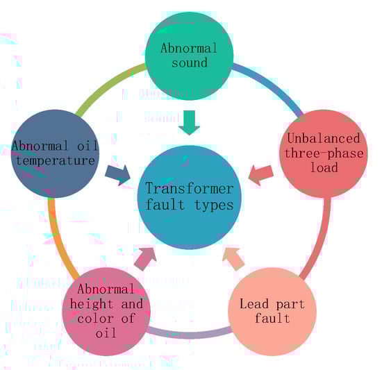 Under the background of rapid economic development and continuous improvement of residents’ living standards, requirements for power demand, power quality and power supply reliability are constantly improving []. In the process of power transmission, distribution and transformation, power transmission and transformation equipment, as an important hub and carrier of energy, play a pivotal role []. Among them, the normal operation of a transformer is the basis of power system security. At present, the annual failure rate of transformers can reach 3~5%. Transformer fault has gradually become the main fault of distribution networks. Damaged transformers not only increase the pressure of management costs but also affect the normal power consumption of residents’ living and production, which has become the actual problem that most often complicates power supply management. Against this backdrop, how to ensure that the power transmission and transformation equipment is in normal operation condition, find potential faults in the equipment in time and carry out rapid maintenance and equipment replacement has become a hotspot of current research [].