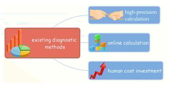 Fault diagnosis refers to judging whether the equipment is in a normal working state according to the operation and maintenance data fed back by monitoring equipment []. With the development and improvement in power grid monitoring systems and data collection platforms, a large amount of data reflecting the working status of equipment and its components can be easily obtained []. Based on these data, the power grid operators and relevant experts can evaluate the equipment status, determine the fault type and scope of influence, predict the changing trend of the fault and then take effective measures to eliminate the fault, determine the appropriate maintenance time and reduce the downtime loss and maintenance costs caused by the fault event [,].