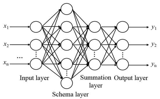 After decades of development and improvement, PNN has been widely used in data classification and nonlinear regression fitting problems because of its simple structure and clear training rules. In addition, the weights of PNN are essentially the distribution of pattern samples, and the network does not need to be trained, so its solution speed is very fast, which can meet the needs of real-time fault diagnosis in the actual power grid. As shown in Figure 3, the typical structure of PNN consists of four layers, from top to bottom, namely, the input layer, schema layer, summation layer and output layer. PNN is a kind of feedforward neural network, so it has unique advantages in pattern classification. The value of the training sample is the input through the input layer. It should be noted that the sample dimension is equal to the number of neurons in the input layer. The number of neurons in the schema layer is generally the largest among the four layers, which is equal to the sum of the number of training samples for each category. The output of each schema unit of the schema layer can be calculated by Formula (1):
