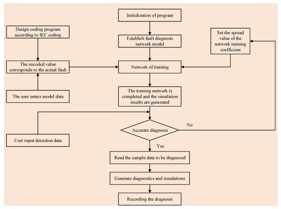 As shown in Figure 5 below, transformer fault diagnosis mainly includes three steps: information coding, data training and fault diagnosis, of which the data training module and fault diagnosis module are the core parts of transformer fault diagnosis. The input data of PSO-PNN fault diagnosis is the dissolved gas, and the output result is the fault type. When the data sample obtained is the content of CH4, H2, C2H2, C2H4 and C2H6, it needs to be coded according to the coding rules shown in Table 1. If the data sample obtained is the ratio of the three gases, it can directly carry out data training and fault diagnosis.