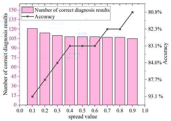 On the other hand, the spread value will also affect the accuracy of fault diagnosis. In order to more intuitively analyze the impact of the spread value, this paper divides the spread value from 0.1 to 0.9 into eight values and uses the same training data and test data for verification and analysis. A total of 130 groups of data are used for analysis during the verification of numerical examples. Because of the large number of samples, they will not be expanded in detail. Figure 6 shows the fault diagnosis accuracy of PNN under different spread values.