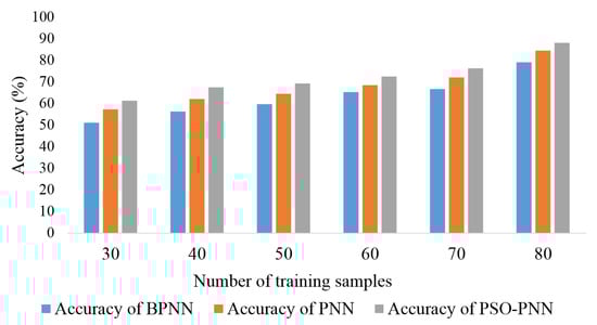 Meanwhile, in order to further illustrate the diagnosis accuracy of the PSO-PNN model, this paper compares it with the general BPNN model and traditional PNN model, where the spread value in PNN is 0.1. The comparison results are shown in Figure 7. It is not difficult to see that with the continuous increase in sample size, the diagnostic accuracy of BPNN, PNN and PSO-BPNN models for fault types is also increasing, and the diagnostic accuracy of the PSO-PNN model is significantly higher than that of BPNN and traditional PNN models. Under the same number of training samples, the accuracy of the PNN transformer fault diagnosis model used in this paper is about 10% higher than that of the general BPNN, and their junction calculation time is basically the same. Therefore, the method proposed in this paper has more advantages in practical application, especially in the case of fewer training samples. In addition, when the number of data samples is 80, the calculation time for BPNN is 64.5 s, whereas the calculation time for the method proposed in this paper is 46.5 s. This is because BPNN belongs to a feedforward neural network and uses a gradient descent iterative algorithm to update the weight parameters, which has obvious defects: firstly, the learning speed is slow, so the system calculation time increases; secondly, the learning rate is difficult to determine and easy to fall into the local minimum; finally, it is prone to over-training, resulting in the reduction of generalization performance. Especially when the number of samples is large, the convergence speed is slow, obviously.