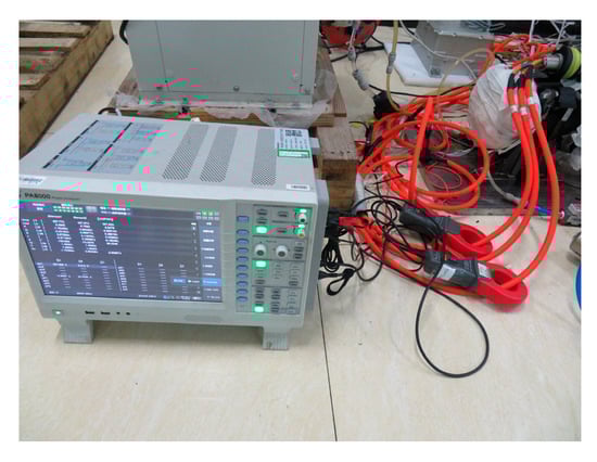 To measure the loss and efficiency of the motor, the loss separation method was used. The voltage of the rated frequency was applied to the tested motor, and the input power p1 was recorded. The experimental platform is shown in Figure 5, with a 540 V output DC power source, variable-frequency drive, power meter and motor. The voltage port of the power meter is connected between the frequency converter and the motor through the terminal, and the current data is clamped with AC current pliers. The output torque of the motor can be measured using a torque-measuring instrument, and the output power p2 of the motor is: