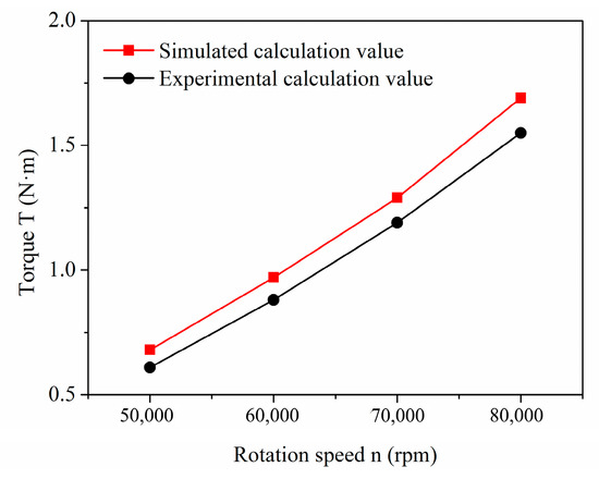 Under the 540 V rated voltage, the motor operating frequency was adjusted, and P1 and T were measured when the readings of power meter and torque meter became stable. The experimental data are shown in Table 4. The torque comparison results from the simulation and test data from 50,000 rpm to 80,000 rpm are shown in Figure 7. The simulation gave torque values slightly higher than the test values, but with consistent trends and average accuracy of 91.1%.