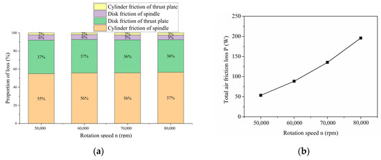 As can be seen from Figure 8a, when the rotation speeds range from 50,000 rpm to 80,000 rpm, the largest proportion of air friction loss is the cylinder surface loss of the main shaft, at about 55%, followed by the disk surface loss of the thrust plate, at about 36%. The cylinder surface and disk surface loss of the thrust plate account for only a relatively small proportion, about 9% in total. Given the small volume of the thrust plate, the heat flux generated by the wind friction loss here is large, and this is a difficulty addressed in the heat dissipation design. As shown in Figure 8b, the overall air friction loss increases exponentially with increases in the rotation speeds, reaching 195.84 W at the rated 80,000 rpm.