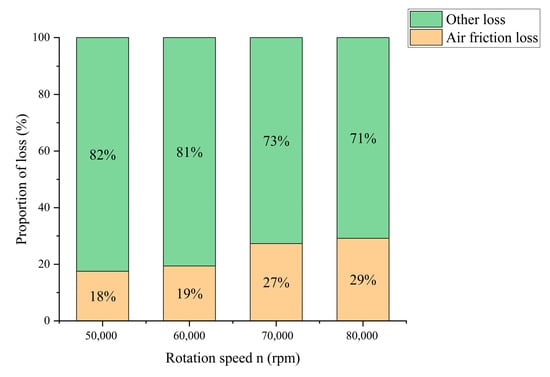 According to the experimental test, the total loss at 50,000 rpm to 80,000 rpm is obtained, and, combined with the simulation calculation results, the air friction loss at different revolutions is separated, as shown in Figure 9. The loss is generally on the rise, and the air friction loss accounts for about 29% of the total loss.