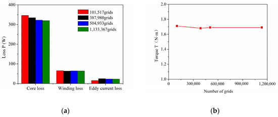 Maxwell 3D cannot use adaptive mesh generation in transient analysis, so it was necessary to verify the mesh independence to eliminate the potential for error arising from differences in mesh generation. The motor model was divided into four kinds of meshes with different degrees of refinement: 101,517, 387,980, 504,933 and 1,133,367. The losses obtained from these different meshes were determined as shown in Figure 10. The curved surface and boundary layer meshes had large influences on the magnetic field solution, and the core loss and eddy current loss fluctuated greatly, but there were few changes in winding loss and torque. From 504,933 to 1,133,367 grids, there were loss differences of 0.8%, 0.9% and 1%, respectively, with no change in torque. Considering the grid error and computer simulation cost, 504,933-grid division was finally selected based on the results.