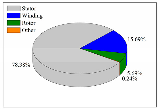 As shown in Figure 11, the maximum magnetic induction intensity occurs at the junction between the stator gear and the yoke. After one power cycle, the core loss value does not rise or show periodicity, but fluctuates stably between 270 W and 500 W. Here, the end winding of the motor accounted for 72.7% of the total length, with losses of asymmetric end winding of 26.1 W and 21.2 W. Other losses determined using three-dimensional simulation are shown in Table 5 and Figure 12. The electromagnetic loss of the whole machine is 410.93 W, and core loss accounted for the highest proportion of the total loss, 78%. The external alloy material of the motor will also be affected by the magnetic field and cause loss, but this loss is too low to be considered.