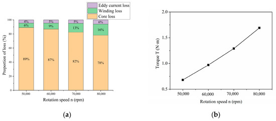 Magnetic induction distribution at 80,000 rpm. (a) Nephogram of magnetic induction. (b) Loss curve.