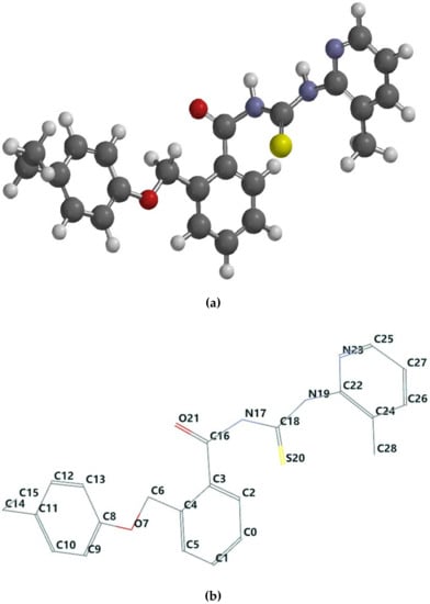 (a) The ball and spoke representation of the 1d molecular structure. (b) The wire label representation of the 1d optimized molecular structure. By convention, the numbering of the atoms was assigned in accordance with Spartan 14 software. Supporting information with respect to the tube and wire label representation for every chemical compound included in the current study is provided in the Supplementary Materials, Figures S1a–o and S2a–o.