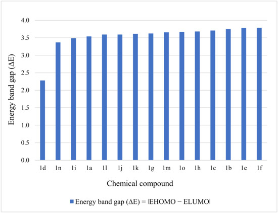 Of significant importance is the energy difference between the highest occupied orbital and the lowest unoccupied orbital, referred to as the HOMO–LUMO gap (∆E). For instance, high values of ∆E are correlated with a high energy needed for electrons to skip from an occupied orbital to an unoccupied orbital. Consequently, the smaller the HOMO–LUMO gap, the higher the chemical reactivity of the molecule. On the contrary, the chemical reactivity is lowered by the increasing of the HOMO–LUMO gap [39,54,55].
