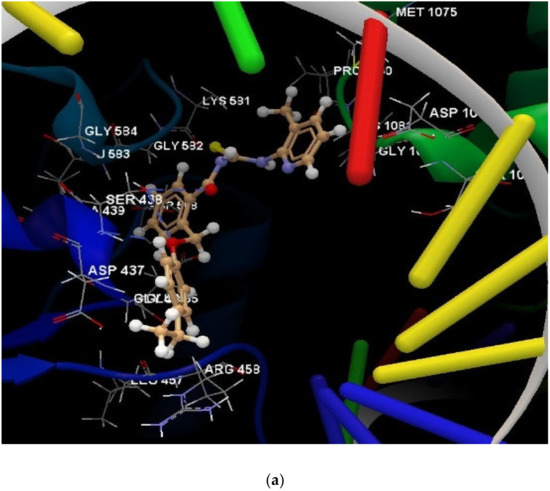 The molecular docking study was intended to predict the complex formed between the ligand and the receptor. The ligand took suitable conformations in the active site of the receptor protein, forming hydrogen bonds with the rest of the amino acids of the selected receptor. The established conformation was then quantified in a docking score, describing the highest match of the studied molecule in the active site of the receptor [64].