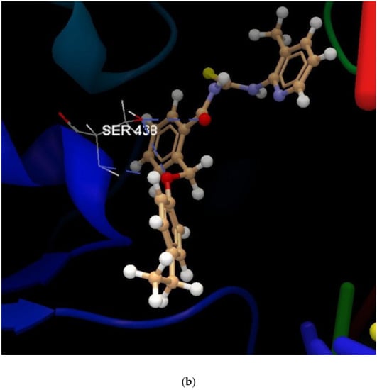 In the same way, 1a and 1c registered a docking score of −28.04. While both formed hydrogen bonds with SER 438 and ASP 437, they differed through the thiazole (1a) and pyridine (1c) moieties attached to the 2-((4-ethylphenoxy) methyl)-N-(heteroarylcarbamothioyl) scaffold.