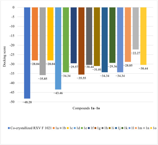 In the present case, the docking scores varied in the range of (−43)–(−22), decreasing according to the sequence: 1d > 1b > 1f > 1e, 1j, 1l > 1i > 1h, 1o > 1f > 1k > 1m > 1a, 1c > 1n.