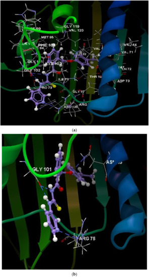 The compound 1c (docking score: −66.87) also formed hydrogen bonds with the amino acid moieties ARG 76 (2.878 Å) and GLY 101 (2.830 Å, 3.182 Å), similarly to the co-crystallized interaction group. Moreover, during the docking process, a resemblance was observed in the behavior of the compound 1n (docking score: −67.58), which formed a hydrogen bound with the same amino acid, GLY 101 (2.755 Å, 3.178 Å). The compound 1n, in particular, had two chloride atoms on the pyridine heterocycle, which was different from molecule 1c. The presence of Cl- radicals on the pyridine nucleus imprinted a lipophile character for the chemical among the series.
