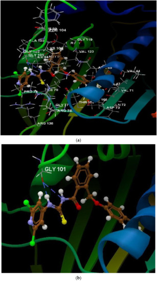 (a) The interaction group for the ligand 1n. (b) Hydrogen bonds created between the ligand 1n and the amino acid GLY 101.