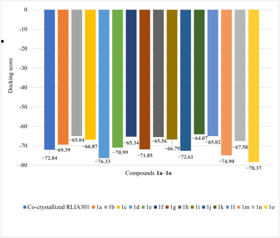 Docking score obtained for the docked compounds 1a–1o and the target protein 4DUH.