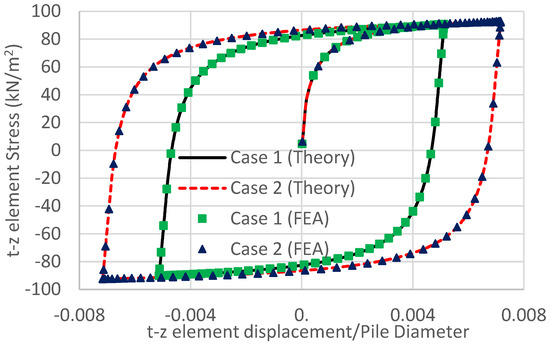 Equation (5) can be used in conjunction with Equations (3) and (4) to obtain the stiffness of the t-z spring during plasticity so that the elastic–plastic t-z spring element can be developed in a nonlinear dynamic finite element program. In order to validate the torsional effect of the proposed t-z spring, a single elastic–plastic t-z spring is used to connect a pile with a diameter of 7.8 m, where one end is fixed, and the other is applied to the sine-shaped shear displacement (z = 0.04 sin(2t) m) and rotation ( = Bsin(2t) rad), in which B = 0 and 0.01 for two pile cases. The material properties of the t-z spring are = 0.35, = 100 kN/m2, Ce = 1.23, = 0.0043 m, and n = 0.85. These parameters were obtained from the curve fitting of the soil near Changhua Offshore in Taiwan, where the sixth layer of soil was used, as shown in Table 1. Both the finite element analysis (FEA) and the numerical solution of Equation (5) (Theory) were performed. The results are shown in Figure 2, where cases 1 and 2 are 0 and 0.01 for B, respectively. This figure provides a good comparison and indicates that the finite element analysis is accurate and feasible for the combination of shear and torsional effects.