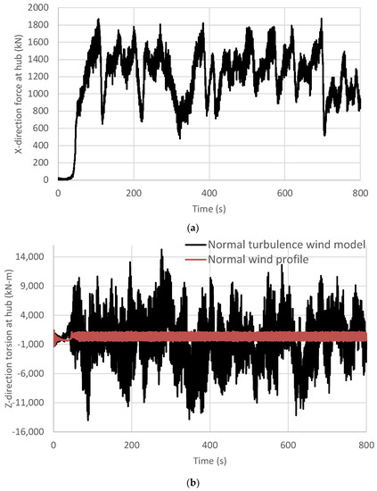 (2) For the tropical cyclone case, the rotor blades are parked under an extreme turbulent wind model (EWM) with the Vhub of 72 m/s from 30° of the X direction, where the yaw misalignment is 60° from the X direction. The reason to use this setting is that it requires large member sections in the steel design for various tropical cyclone conditions, as shown in Table 2 of ref. [19]. The parked rotor-induced torsions are still large due to the 30° wind direction and the yaw misalignment. However, the main frequency of the torsion is much smaller than the structural natural frequency in the vertical rotation direction, so the condition of resonance and near resonance does not occur. The time–history torsion of the support structure is not large, and the vertical settlement is controlled by the vertical shear force. Thus, the results of Cases 1 and 2 boundary conditions are not very different.