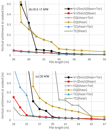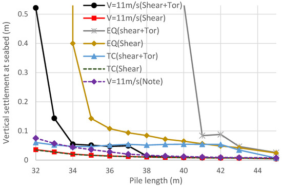 The changes in the pile vertical displacement in the sea bed with the used pile length for the 10 MW case under the loads of DLC 1.1 (Vhub = 11 m/s), DLC 1.8 (0.32 g earthquake and Vhub = 11.4 m/s), and DLC I.2 (Tropical cyclone Vhub = 72 m/s) (Note = (Shear + Tor) the yaw stiffness equal to 3 × 105 kN-m/rad).