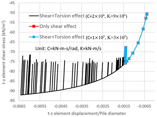 D is the pile diameter (m) (D = 2R), is the element segment interval (m), is the incremental force of the t-z spring (kN), , and . Equation (4) shows the components of the stiffness matrix of the shear and torsional t-z curve elements, where is the traditional t-z curve stiffness considering only the shear stress. Any t-z curve formulation can be used for , and we use a cyclic formulation to validate them in the next section. In Equation (4), if the torsion T and the twist angle are equal to zero, then we set and to generate the standard t-z curve stiffness for the degree of freedom of the shear force.