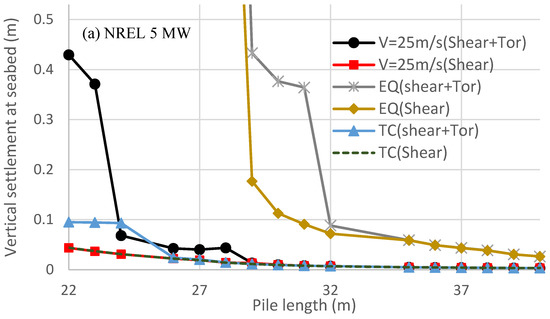 Figure 6 shows that the vertical settlement of the pile at the seabed varies with the used pile length for various load cases. This figure indicates the following features: