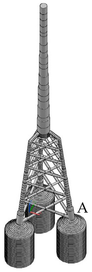 Suction piles, similar to monopiles, have large cross-sectional diameters, and we can demonstrate that fatigue calculations for jacket structures with suction piles may not be correct if conventional t-z springs without torsional effect are used. The illustration of the complex finite element model is omitted here, and only the finite element results of the support structure using 15 MW OWT jacket three-leg suction piles are discussed. As shown in Figure 9, three-dimensional beam elements were used to model the pile, and the p-y, t-z, and Q-z nonlinear springs were used to model the soil–structure interaction. The finite element analysis and fatigue design indicate that the column thickness at joint A (Figure 9) requires 10.7 cm using the proposed t-z spring with the torsional effect, while it requires 17.7 cm using the conventional t-z spring. The reason is that the oscillation of the suction pile in the vertical direction cannot be avoided because there is no torsional constraint.