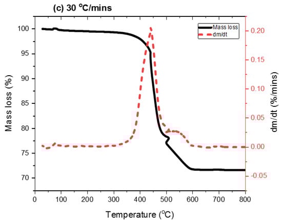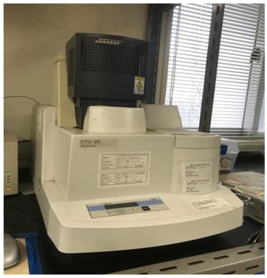 Using the TG-DTA device (DTG-60 Shimadzu Corporation) presented in Figure 3, thermogravimetric analysis (TGA) techniques were conducted and used to evaluate the degradation process and thermal stability []. The furnace’s Pt cell was covered with the produced MPs (5 mg), and the carrier gas (Ar) was inserted to fill the device for 15 min. The PET MPs were warmed from ambient temperature to 700 °C at a different heating rate of 10 to 30 °C/min, with an Ar stream flow rate of 100 mL/min. On the weight loss and related weight loss bends, plotting and analysis were completed. The multiple heating rates were considered following recommendations of the ICTAC [].