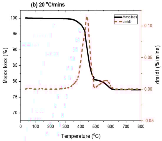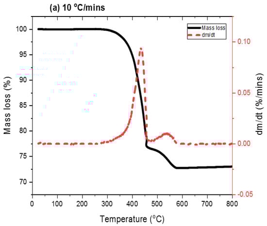 Thermogravimetric analysis is used to study the thermal decomposition of solid materials, and the variations in conversion rate with time and temperature under various thermal conditions can provide information about the degradation process, such as the decomposition temperature, the peak temperature, and the average reaction rate []. The mathematical formula for the thermal deterioration of materials in non-isothermal conditions is presented in Equation (1). This equation is generally used for describing the single-step thermal decomposition processes [],