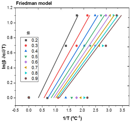 The Friedman, Arrhenius, and Coats-Redfern plots for the thermal degradation of PET MPs is presented in Figure 5 and Figure 6, while the activation energy values, calculated by the Friedman, Arrhenius, and Coats-Redfern models, at different conversions, is presented in Table 3 and Table 4. In the tables, the results for the activation energy (E) and pre-exponential factor (A) is presented. The bare minimum additional energy needed by a reactive molecule to transform into a product is known as activation energy. It is also known as the minimal energy required to energize or activate molecules or atoms in order for them to engage in a chemical reaction or transformation. The result from the Friedman model showed very low E values at different conversions, which ranged from 3.31. kJ/mol to 8.79 kJ/mol with an average of 6.86 kJ/mol, although the coefficient of determination ranged from 0.8648 to 0.9567 (Table 3). The obtained results in this study show lower than previously reported E (activation energy) values for pyrolyzed PET waste using the same model. Mishra et al. [] studied the co-pyrolysis of PET with biomass seeds using the Friedman model and reported a variation in E values from 208.6 to 236.0 kJ/mol for conversion of 0.1–0.8. They performed the kinetic modelling based on three heating rates of 10, 30, and 50 °C/min. The co-pyrolysis process influenced the E values. However, when Das and Tiwari [] used the isoconversional approach to test the kinetic parameters for PET pyrolysis at high heating rates of 5, 10, 20, 40, and 50 °C/min, they found that the E values ranged from 196–217 kJ/mol.