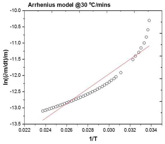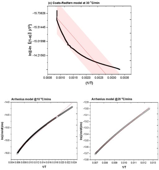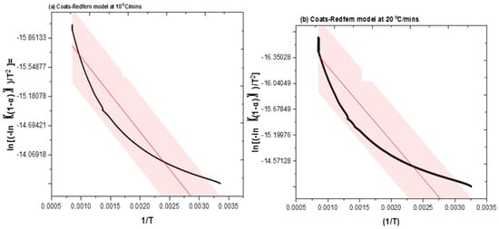 In this study, the Coats-Redfern method was used to model the thermogravimetric process. This is an integral model-fitting method that involves fitting various reaction models to the extent of the reaction-temperature curves, and simultaneously determining the activation energy and pre-exponential factor. This model equation is presented in Equation (5):